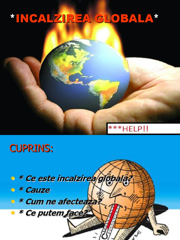 De cativa ani, incalzirea globala, incalzirea treptata a suprafetei uscatului si a oceanelor pamantului a devenit un subiect foarte dezbatut de comunitatea stiintifica. Una dintre cele mai importante probleme ecologice globale este efectul de seră. Metodele pentru reducerea emisiilor cu efect de sera sunt multiple si accesibile tuturor, fara a fi necesare investitii substantiale. Evident ca atunci cand discutam de incalzirea globala, imediat incepem cu gazele de sera si poluarea, nimic mai adevarat ca incalzirea globala este reala, ne afecteaza, o vedem zilnic, o tratam superficial, iar ceea ce tine efectiv de rasa umana sa faca ceva in ideea potolirii efectelor produse. Prin cresterea temperaturii ghetarii se vor topi efectul de sera,topirea ghetarilor,disparitia animaleleor,cresterea nivelului oceanic,inundatiile,fenomene climatice extreme,poluarea industriala.