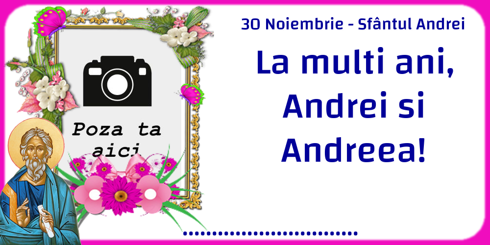 De ziua numelui tău, iți doresc tot binele din lume, noroc, fericire si sănătate si sa ti se îndeplinească toate dorințele pe care o sa ti le pui. Andrei e sărbătoare mare în biserica ortodoxă română, dar și în familile a milioane de români. De obicei, in podul casei sint urcate 12 cepe.