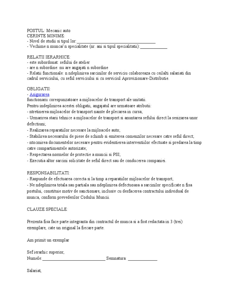 vizitati articolul complet aici : https://hmw.dumindasv430.pw/fisa-post-tipograf-tiparitor.html Fisa postului este un document obligatoriu ,e semnat de catre salariat la data incheierii contractului individual de munca si constituie anexa la in incheiere, voi enumera cateva texte din codul muncii care fac referire directa sau indirecta la fisa postului Stabilite, de la caz la caz, in functie de codul muncii, contracte colective aplicabile), modalitatea de solutionare a litigiilor izvorate din contract. Condica de prezenta a salariatilor impreuna cu fișele de pontaj zilnice devin obligatorii din luna septembrie 2017 avand in vedere ultimele modificari.