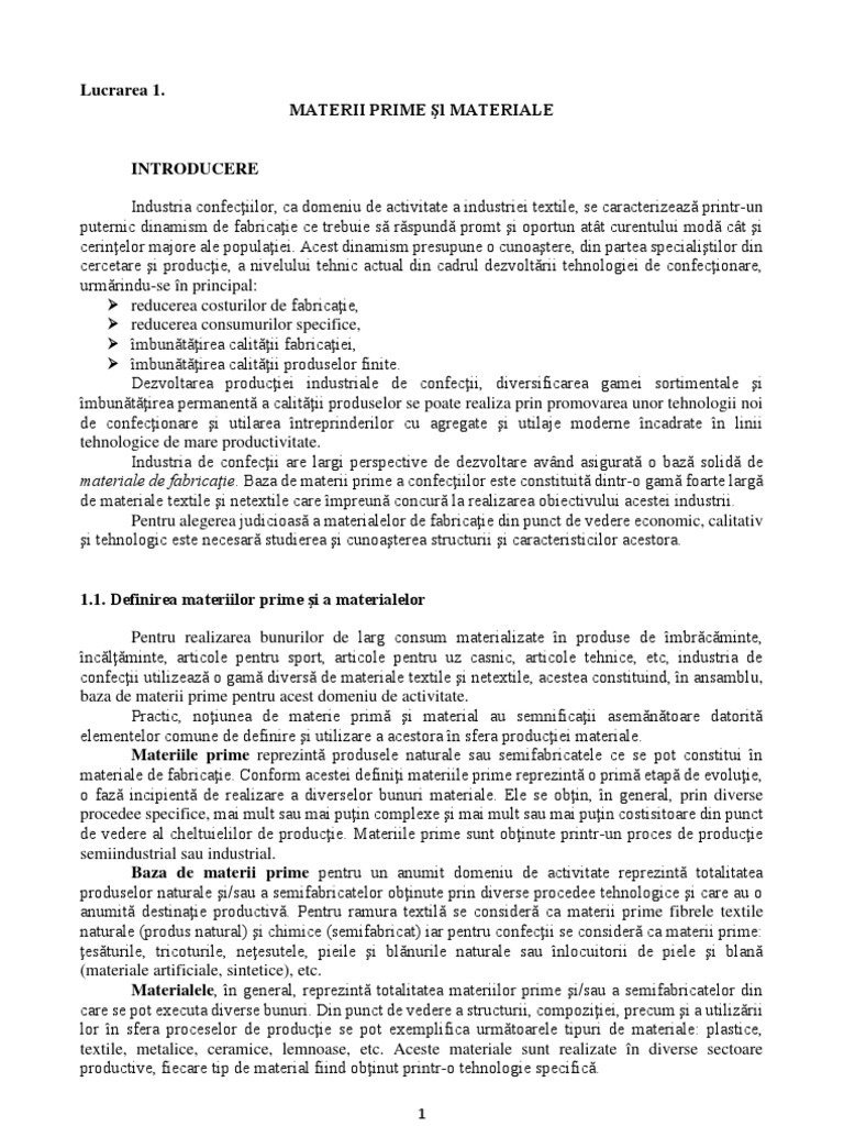 Dezvoltarea productiei industriale de confectii, diversificarea gamei sortimentale si imbunatatirea permanenta a calitatii materialele, in general, reprezinta totalitatea materiilor prime si/sau a semifabricatelor din care se pot executa diverse bunuri. Materiile prime cu un grad ridicat de prelucrare, din care se confectioneaza produse, se numesc materiale.